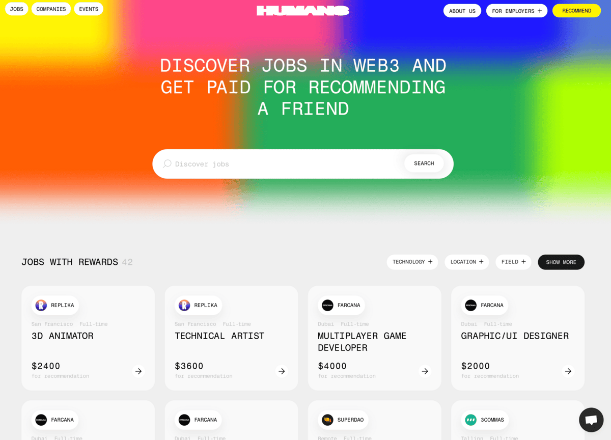 Humans is a platform where you can recommend a friend for a job and get paid for it, like becoming a recruiter where you get the full bounty from HR rather than the second hand one from your mate.