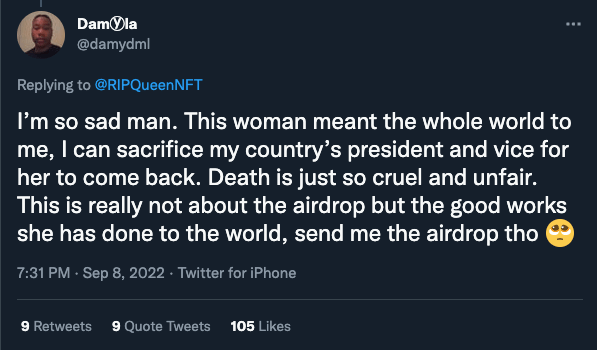 I donβt feel bad for you if you minted a Queen of England themed NFT today and got rugged.